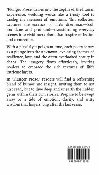 "Plunger Prose" delves into the depths of the human experience, wielding words like a trusty tool to unclog the messiest of emotions. This collection captures the essence of life's dilemmas-both mundane and profound-transforming everyday scenes into vivid metaphors that inspire reflection and connection. With a playful yet poignant tone, each poem serves as a plunge into the unknown, exploring themes of resilience, love, and the often-overlooked beauty in chaos. The imagery flows effortlessly, inviting readers to embrace the rich textures of life's intricate layers. In "Plunger Prose," readers will find a refreshing blend of humor and insight, inviting them to not just read, but to dive deep and unearth the hidden gems within their own stories. Prepare to be swept away by a tide of emotion, clarity, and witty wisdom that lingers long after the last verse.