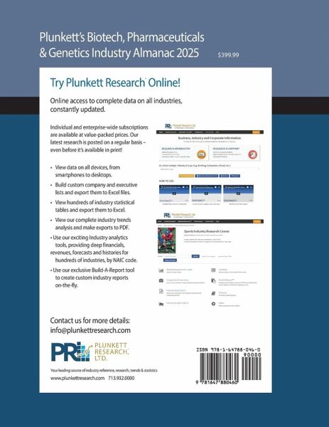 Formally Plunkett's Biotech & Genetics Industry Almanac, this book is a complete reference guide to the business side of biotechnology, genetics, proteomics and related services. This new book contains complete profiles of the leading biotech companies; in-depth chapters on trends in genetics, technologies, statistics and finances; a handy glossary; and thorough indexes. For the first time, in one carefully researched volume, you'll get all of the data you need. Topics include: biotechnology funding and investments; activities in Singapore, China and India; FDA; gene therapies; personalized medicine; systems biology; clinical trials; stem cells; therapeutic cloning; nanotechnology; agricultural biotechnology (GM seeds); drug delivery systems; and ethical issues. The book includes complete profiles on 350 top Biotech & Genetics companies, our own unique list of companies that are the leaders in biotechnology. All of the corporate profile information is indexed and cross-indexed. Includes contact names, addresses, Internet addresses, fax numbers and toll-free numbers, plus growth and hiring plans, finances, research, marketing, technology, acquisitions and much more for each firm. You'll find a complete overview, industry analysis and market research report in one superb, value-priced package.
