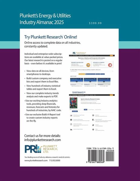 Plunkett's Energy Industry Almanac is an in-depth reference tool that covers everything from major oil companies to independents, utilities, pipelines, coal, LNG, oil field services, refiners and more. It features our famous trends and technologies analysis, and includes statistical tables, a glossary and our unique profiles of The Energy 500 Firms. The energy industry is boiling over with changes. Deregulation, new opportunities in foreign fields and markets, as well as environmental challenges are rushing together head-on to shape the energy and utilities business of the future. Meanwhile China has become a major energy importer and Russia has become a major exporter. Renewable and alternative energy sources are developing quickly, including big investments in wind power and solar power. This exciting new reference book covers everything from major oil companies to electric and gas utilities, plus pipelines, regulatory issues, investments, finance, research and development, refiners, retailers, oil field services and engineering. Petroleum topics include upstream and downstream. Additional topics include coal, natural gas and LNG. Statistical tables cover everything from energy consumption, production and reserves to imports, exports and prices. Next, our unique profiles of the Energy 500 Firms are also included, with such vital details as executive contacts by title, revenues, profits, types of business, Internet addresses, growth plans and more. You'll find a complete overview, industry analysis and market research report in one superb, value-priced package.