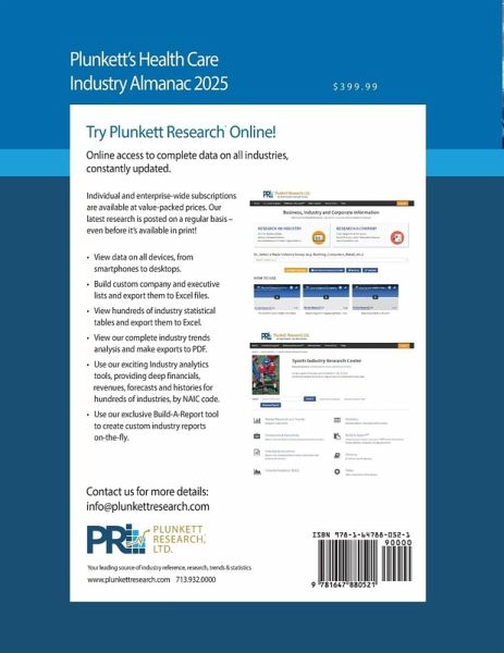 Plunkett's Health Care Industry Almanac is the only complete reference to the American Health Care Industry and its leading corporations. No other source provides this massive book's easy-to-understand comparisons of national health expenditures, emerging technologies, patient populations, hospitals, clinics, corporations, research, Medicare, Medicaid, managed care and many other areas of vital importance. Features dozens of statistical tables covering every aspect of the industry, including Medicare expenditures, hospital utilization, insured and uninsured populations, revenues and health…mehr