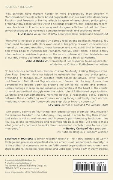 Faith-based organizations play a major role in providing a host of health, educational, and social services to the public. Nearly all these efforts, however, have been accompanied by intense debate and numerous legal challenges. The right of faith-based organizations to hire based on religion, the presence of religious symbols and icons in rooms where government-subsidized services are provided, and the enforcement of gay civil rights to which some faith-based organizations object all continue to be subjects of intense debate and numerous court cases. In Pluralism and Freedom, Stephen V. Monsma explores the question of how much autonomy should faith-based organizations retain when they enter the public realm? He contends that pluralism and freedom demand their religious freedom be respected, but that freedom of all religious traditions and of the general public and secular groups be equally respected, ideals that neither the left nor the right live up to. In response, Monsma argues that democratic pluralism requires a genuine, authentic-but also a limited-autonomy for faith-based organizations providing public services, and offers practical, concrete public policy applications of this framework in practice.