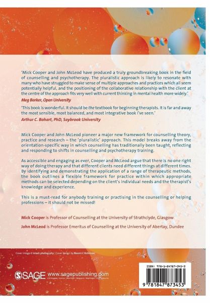 "Mick Cooper and John McLeod have produced a truly groundbreaking book in the field of counselling and psychotherapy which immediately ranks as one of the most significant in terms of influencing my own thinking and practice. The pluralistic approach is likely to resonate with many who have struggled to make sense of multiple approaches and practices which all seem potentially helpful, and the positioning of the collaborative relationship with the client at the centre of the approach fits very well with current thinking in mental health more widely. The book brings together a wealth of relevant theory and research, with illuminating examples. It is a valuable counter to the overly precious 'us and them' type thinking that can be so prevalent in the counselling and psychotherapy world, and gives us new and helpful ways of speaking our experiences of therapy." - Meg Barker, Open University, co-author of Understanding Counselling and Psychotherapy, 2010, SAGE