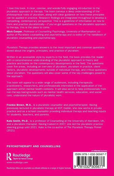 Frankie Brown, M.A., is a pluralistic counsellor and psychotherapist. Having previously lectured in pluralistic therapy at IICP, Dublin, she now works in private practice and as a school counsellor providing individual therapy and teaching inputs for students, teachers, and parents. Kate Smith, Ph.D., is a professor of Counselling at the University of Aberdeen, UK, and a pluralistic therapist. Having trained in 2007, she led the pluralistic practice steering group until 2021. Kate is the co-author of The Pluralistic Therapy Primer (2021).