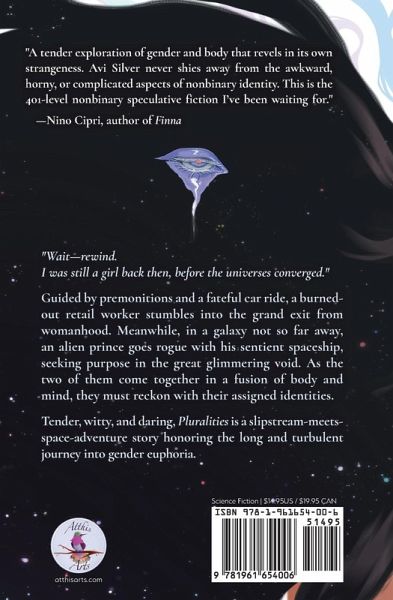 "Wait-rewind. I was still a girl back then, before the universes converged." Guided by premonitions and a fateful car ride, a burned-out retail worker stumbles into the grand exit from womanhood. Meanwhile, in a galaxy not so far away, an alien prince goes rogue with his sentient spaceship, seeking purpose in the great glimmering void. As the two of them come together in a fusion of body and mind, they must reckon with their assigned identities. Tender, witty, and daring, Pluralities is a slipstreammeets-space-adventure story honoring the long and turbulent journey into gender euphoria.