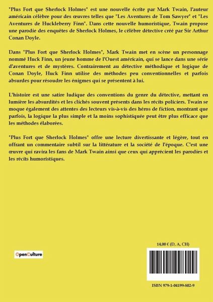 "Plus Fort que Sherlock Holmes" est une nouvelle écrite par Mark Twain, l'auteur américain célèbre pour des ¿uvres telles que "Les Aventures de Tom Sawyer" et "Les Aventures de Huckleberry Finn". Dans cette nouvelle humoristique, Twain propose une parodie des enquêtes de Sherlock Holmes, le célèbre détective créé par Sir Arthur Conan Doyle. Dans "Plus Fort que Sherlock Holmes", Mark Twain met en scène un personnage nommé Huck Finn, un jeune homme de l'Ouest américain, qui se lance dans une série d'aventures et de mystères. Contrairement au détective méthodique et logique de Conan Doyle, Huck Finn utilise des méthodes peu conventionnelles et parfois absurdes pour résoudre les énigmes qui se présentent à lui. L'histoire est une satire ludique des conventions du genre du détective, mettant en lumière les absurdités et les clichés souvent présents dans les récits policiers. Twain se moque également des attentes des lecteurs vis-à-vis des héros de fiction, montrant que parfois, la logique la plus simple et la moins sophistiquée peut être plus efficace que les méthodes élaborées. "Plus Fort que Sherlock Holmes" offre une lecture divertissante et légère, tout en offrant un commentaire subtil sur la littérature et la société de l'époque. C'est une ¿uvre qui ravira les fans de Mark Twain ainsi que ceux qui apprécient les parodies et les récits humoristiques.