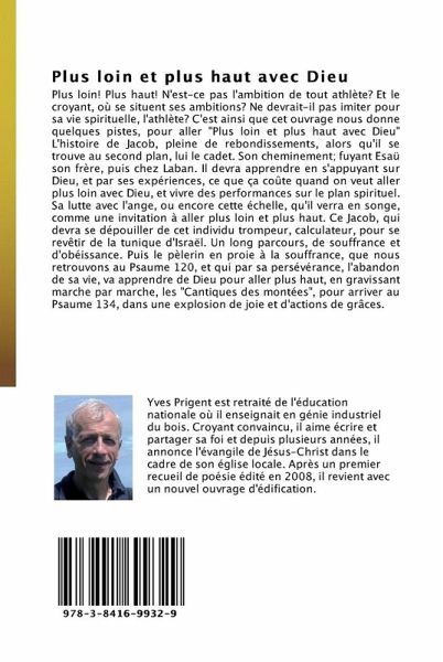 Plus loin! Plus haut! N'est-ce pas l'ambition de tout athlète? Et le croyant, où se situent ses ambitions? Ne devrait-il pas imiter pour sa vie spirituelle, l'athlète? C'est ainsi que cet ouvrage nous donne quelques pistes, pour aller "Plus loin et plus haut avec Dieu" L'histoire de Jacob, pleine de rebondissements, alors qu'il se trouve au second plan, lui le cadet. Son cheminement; fuyant Esaü son frère, puis chez Laban. Il devra apprendre en s'appuyant sur Dieu, et par ses expériences, ce que ça coûte quand on veut aller plus loin avec Dieu, et vivre des performances sur le plan spirituel. Sa lutte avec l'ange, ou encore cette échelle, qu'il verra en songe, comme une invitation à aller plus loin et plus haut. Ce Jacob, qui devra se dépouiller de cet individu trompeur, calculateur, pour se revêtir de la tunique d'Israël. Un long parcours, de souffrance et d'obéissance. Puis le pèlerin en proie à la souffrance, que nous retrouvons au Psaume 120, et qui par sa persévérance, l'abandon de sa vie, va apprendre de Dieu pour aller plus haut, en gravissant marche par marche, les "Cantiques des montées", pour arriver au Psaume 134, dans une explosion de joie et d'actions de grâces.