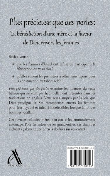 Saviez-vous : que les femmes d’Israel ont refusé de participer à la fabrication du veau d’or ? qu’elles étaient les premières à offrir leurs bijoux pour la construction du tabernacle? Plus précieuse que des perles examine les nuances du texte hébreu qui ne sont pas habituellement présentes dans les traductions en anglais. Vous serez surpris par la joie que Dieu prodigue et Ses récompenses envers les femmes pour leur loyauté et fidélité indéfectibles lorsque la foi des hommes vacillait. Cet ouvrage inclut des prières pour vous et les femmes de votre entourage. Pour les mères ou les grand-mères, ces chapitres incluent également une prière à déclarer sur vos enfants.