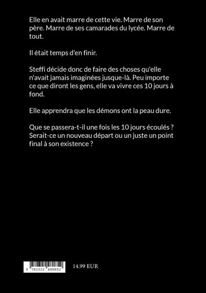 Elle en avait marre de cette vie. Marre de son père. Marre de ses camarades du lycée. Marre de tout.Il était temps d'en finir.Steffi décide donc de faire des choses qu'elle n'avait jamais imaginées jusque-là. Peu importe ce que diront les gens, elle va vivre ces 10 jours à fond.Elle apprendra aussi que les démons ont la peau dure.Que se passera-t-il une fois les 10 jours écoulés ? Serait-ce un nouveau départ ou juste un point final à son existence ?