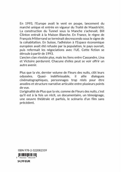En 1993, l'Europe avait le vent en poupe, lancement du marché unique et entrée en vigueur du Traité de Maastricht. La construction du Tunnel sous la Manche s'achevait. Bill Clinton entrait à la Maison Blanche. En France, le règne de François Mitterrand se terminait decrescendo sous le signe de la cohabitation. En Suisse, l'adhésion à l'Espace économique européen avait été refusée par la population, le pays ouvrait, puis refermait les négociations avec l'UE. Cette fiction se déroule à partir de 1993. L'ancien clan n'existe plus, mais les liens entre Cassandre, Lina et Victoire perdurent. Chacune d'elles peut se voir offrir un autre avenir. Plus que la vie, dernier volume de Fleurs des nuits, clôt leurs odyssées. Quasi-indéfinissable, il allie dialogues cinématographiques, personnages trop réels pour être anodins et structure narrative articulée entre plusieurs points de vue.L'originalité de Plus que la vie, comme de Fleurs des nuits, c'est qu'il est à la fois un récit, un documentaire, un témoignage, une oeuvre théâtrale et parfois, le scénario d'un film sans précédent.