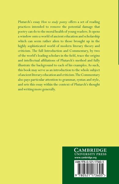 Plutarch's essay 'How to Study Poetry' offers a set of reading practices intended to remove the potential damage that poetry can do to the moral health of young readers. It opens a window on to a world of ancient education and scholarship which can seem rather alien to those brought up in the highly sophisticated world of modern literary theory and criticism. The full Introduction and Commentary, by two of the world's leading scholars in the field, trace the origins and intellectual affiliations of Plutarch's method and fully illustrate the background to each of his examples. As such this book may serve as an introduction to the whole subject of ancient reading practices and literary criticism. The Commentary also pays particular attention to grammar, syntax and style, and sets this essay within the context of Plutarch's thought and writing more generally.