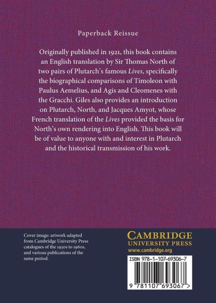 Originally published in 1921, this book contains an English translation by Sir Thomas North of two pairs of Plutarch's famous Lives, specifically the biographical comparisons of Timoleon with Paulus Aemelius, and Agis and Cleomenes with the Gracchi. Giles also provides an introduction on Plutarch, North, and Jacques Amyot, whose French translation of the Lives provided the basis for North's own rendering into English. This book will be of value to anyone with and interest in Plutarch and the historical transmission of his work.