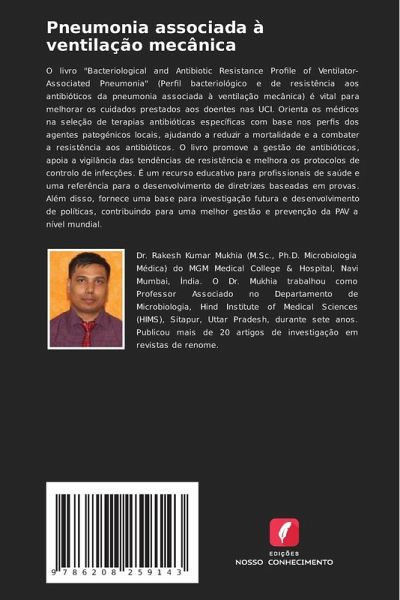 O livro "Bacteriological and Antibiotic Resistance Profile of Ventilator-Associated Pneumonia" (Perfil bacteriológico e de resistência aos antibióticos da pneumonia associada à ventilação mecânica) é vital para melhorar os cuidados prestados aos doentes nas UCI. Orienta os médicos na seleção de terapias antibióticas específicas com base nos perfis dos agentes patogénicos locais, ajudando a reduzir a mortalidade e a combater a resistência aos antibióticos. O livro promove a gestão de antibióticos, apoia a vigilância das tendências de resistência e melhora os protocolos de controlo de infecções. É um recurso educativo para profissionais de saúde e uma referência para o desenvolvimento de diretrizes baseadas em provas. Além disso, fornece uma base para investigação futura e desenvolvimento de políticas, contribuindo para uma melhor gestão e prevenção da PAV a nível mundial.