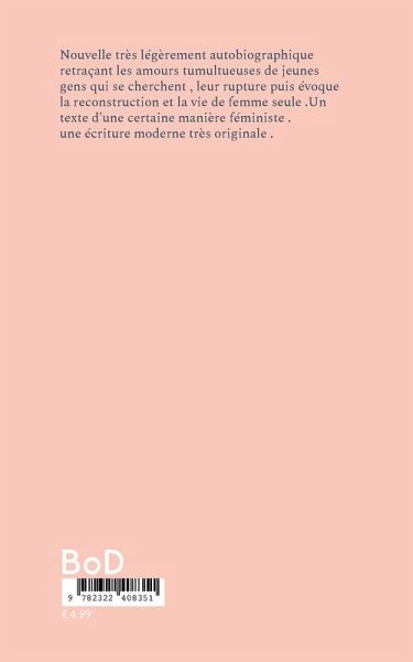 Nouvelle très légèrement autobiographique retraçant les amours tumultueuses de jeunes gens qui se cherchent , leur rupture puis évoque la reconstruction et la vie de femme seule .Un texte d'une certaine manière féministe .une écriture moderne très originale .