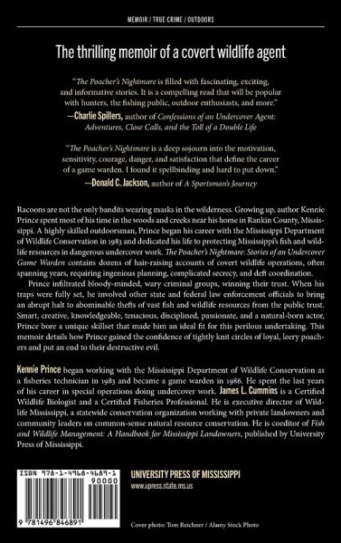 Racoons are not the only bandits wearing masks in the wilderness. Growing up, author Kennie Prince spent most of his time in the woods and creeks near his home in Rankin County, Mississippi. A highly skilled outdoorsman, Prince began his career with the Mississippi Department of Wildlife Conservation in 1983 and dedicated his life to protecting Mississippi's fish and wildlife resources in dangerous undercover work. The Poacher's Nightmare: Stories of an Undercover Game Warden contains dozens of hair-raising accounts of covert wildlife operations, often spanning years, requiring ingenious planning, complicated secrecy, and deft coordination. Prince infiltrated bloody-minded, wary criminal groups, winning their trust. When his traps were fully set, he involved other state and federal law enforcement officials to bring an abrupt halt to abominable thefts of vast fish and wildlife resources from the public trust. Smart, creative, knowledgeable, tenacious, disciplined, passionate, and a natural-born actor, Prince bore a unique skillset that made him an ideal fit for this perilous undertaking. This memoir details how Prince gained the confidence of tightly knit circles of loyal, leery poachers and put an end to their destructive evil.