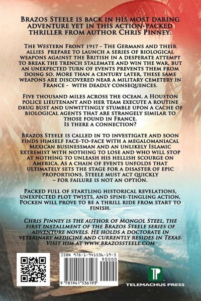 The Western Front 1917 - The Germans and their allies prepare to launch a series of biological weapons against the British in a desperate attempt to break the trench stalemate and win the war, but an unexpected turn of events prevents them from doing so. More than a century later, these same weapons are discovered near a military cemetery in France - with deadly consequences. Five thousand miles across the ocean, a Houston police lieutenant and her team execute a routine drug bust and unwittingly stumble upon a cache of biological agents that are strangely similar to those found in France. Is there a connection? Brazos Steele is called in to investigate and soon finds himself face-to-face with a megalomaniacal Mexican businessman and an unlikely Islamic extremist with nothing to lose and who will stop at nothing to unleash his hellish scourge on America. As a chain of events unfolds that ultimately sets the stage for a disaster of epic proportions, Steele must act quickly ¿ for failure is not an option. Packed full of startling historical revelations, unexpected plot twists, and spine-tingling action, Pocken will prove to be a thrill ride from start to finish.