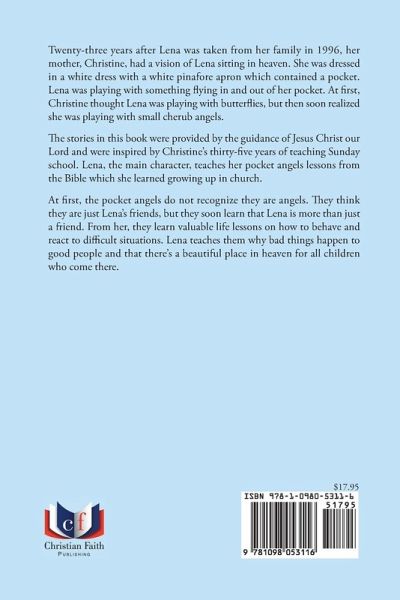 Twenty-three years after Lena was taken from her family in 1996, her mother, Christine, had a vision of Lena sitting in heaven. She was dressed in a white dress with a white pinafore apron which contained a pocket. Lena was playing with something flying in and out of her pocket. At first, Christine thought Lena was playing with butterflies, but then soon realized she was playing with small cherub angels. The stories in this book were provided by the guidance of Jesus Christ our Lord and were inspired by Christine's thirty-five years of teaching Sunday school. Lena, the main character, teaches her pocket angels lessons from the Bible which she learned growing up in church. At first, the pocket angels do not recognize they are angels. They think they are just Lena's friends, but they soon learn that Lena is more than just a friend. From her, they learn valuable life lessons on how to behave and react to difficult situations. Lena teaches them why bad things happen to good people and that there's a beautiful place in heaven for all children who come there.