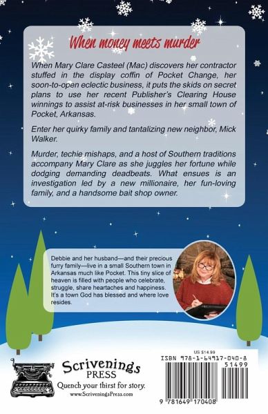 When Mary Clare Casteel (Mac) discovers her contractor stuffed in the display coffin of Pocket Change, her soon-to-open eclectic business, it puts the skids on secret plans to use her recent Publisher's Clearing House winnings to assist at-risk businesses in her small town of Pocket, Arkansas. Enter her quirky family and tantalizing new neighbor, Mick Walker. Murder, techie mishaps, and a host of Southern traditions accompany Mary Clare as she juggles her fortune while dodging demanding deadbeats. What ensues is an investigation led by a new millionaire, her fun-loving family, and a handsome bait shop owner.