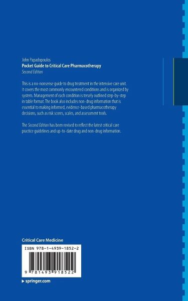 This is a no-nonsense guide to drug treatment in the intensive care unit. It covers the most commonly encountered conditions and is organized by system. Management of each condition is tersely outlined step-by-step in table format. The book also includes non-drug information that is essential to making informed, evidence-based pharmacotherapy decisions, such as risk scores, scales, and assessment tools.