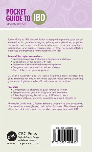 Pocket Guide to IBD, Second Edition is designed to provide quick clinical information for gastroenterologists, primary care physicians, physician assistants, and nurse practitioners who need to review symptoms, medications, and disease management, in order to decide effective diagnoses and treatments for their patients with IBD.