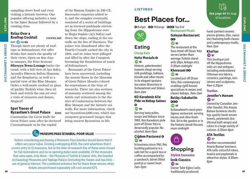Our Pocket guidebook format provides you with the best insider knowledge and local know-how for planning trips between 1 - 7 days Find what you're looking for fast with this guide's all-new structure and design and navigate Istanbul with ease Get fresh takes on must-visit sights including Aya Sofya, Golden Horn Ferry Trip, and Museum of InnocenceExciting Three Perfect Days itineraries help you to create your ideal trip with suggestions of unmissable attractions and activities to match your passions Find the local vibe on foot! Walking tours in every chapter introduce each neighbourhood's personality and get you to those 'don't miss' sights Discover 'A Few Surprises' in a new feature that showcases Istanbul's best kept secrets and rising trends Navigate public transport confidently with clear instructions and tips in our 'Getting Around' sectionMake quick travel decisions using 'Trip Planning' pages that include top pick lists and tips about what to book in advance Eat, drink, and shop like a local with extensive listings of the top restaurants, bars, markets, and street vendorsEssential information toolkit containing tips on arriving; transport; food, drink & nightlife; LGBTIQ+ travel advice; useful words and phrases; accessibility; and responsible travel Inspiring full-colour travel photography and maps including a pull out mapof IstanbulCovers: Sultanahmet & Sirkeci; Bazaar District; Golden Horn & Western Districts; Beyoglu & Around; Bosphorus Suburbs; Kadiköy & Moda plus day trips to Princes' Islands