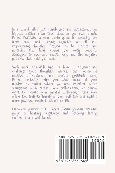 In a world filled with challenges and distractions, our biggest battles often take place in our own minds. Pocket Positivity is your go-to guide for silencing the inner critic and turning negative self-talk into empowering thoughts. Designed to be practical and portable, this book equips you with powerful strategies to overcome doubt, fear, and the negative patterns that hold you back. With quick, actionable tips like how to recognize and challenge toxic thoughts, harness the power of positive affirmations, and practice gratitude daily, Pocket Positivity helps you take control of your mindset no matter where you are. Whether you're struggling with stress, low self-esteem, or simply want to elevate your mental well-being, this book offers the tools to transform your self-talk and build a more positive, resilient outlook on life. Empower yourself with Pocket Positivity-your personal guide to beating negativity and fostering lasting confidence and self-belief.