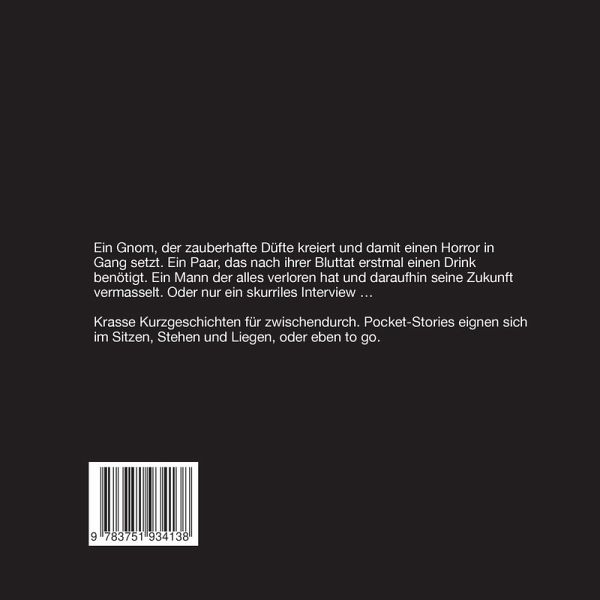 Ein Gnom, der zauberhafte Düfte kreiert und damit einen Horror in Gang setzt. Ein Paar, das nach ihrer Bluttat erstmal einen Drink benötigt. Ein Mann der alles verloren hat und daraufhin seine Zukunft vermasselt. Oder nur ein skurriles Interview.Krasse Kurzgeschichten für zwischendurch. Pocket-Stories eignen sich im Sitzen und Stehen, oder eben to go.