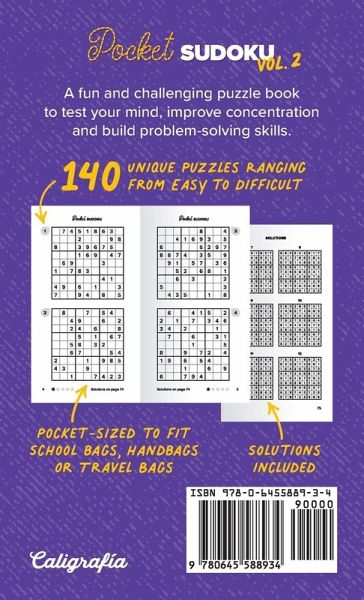 Pocket Sudoku Vol 2 is a fun and challenging puzzle book to test your mind, improve concentration and build problem-solving skills. With 140 unique puzzles ranging from easy to difficult, this book is the perfect size to fit your school bag, handbag or travel bag, for sudoku on-the-go.