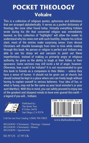 This is a collection of religious quotes, aphorisms and definitions that are arranged alphabetically. It serves as a pocket dictionary of theology like none other found today. Virtually everything Voltaire wrote during his life that concerned religion was immediately banned, so this collection of "highlights" will allow the reader to understand why his views met with such hostility. Despite his critical slant, most of the entries make surprising sense. Even devout Christians will chuckle knowingly from time to time while reading through this book. No person or religion is perfect and Voltaire was able to use his sharp wit and sarcasm to point out these imperfections. Instead of making us primarily angry at religious authority, he gives us the ability to laugh at their follies or their ignorance. Some sections may still incite a bit of anger, however. Otherwise, how could it be Voltaire? It is not recommended to give this book to friends as a companion to their Bibles - unless they have a sense of humor. It should not be given out at church, but should instead be kept in a place where one can freely laugh without having to explain oneself to serious believers. Your idea of fun, or what is funny, may not be the same as your local minister's or your aunt Martha's. With this in mind, you can safely proceed to enjoy one of the greatest and sharpest minds to have ever graced this earth - a legend if you will... Voltaire.