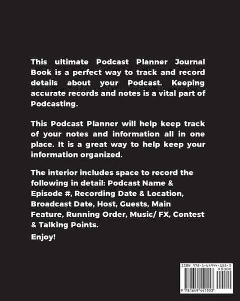 This beautiful Podcast Planner is a perfect way to keep your podcast episodes organized. This will help in your business planning and management of your podcast content and agenda whether you record and post daily, weekly, or monthly. Each page includes space for: Podcast Name & Episode # - Write the Name of your Podcast and the Episode number. Recording Date, Broadcast Date, & Recording Location - Log the date and location details. Host - Record the Host's name. Guests - For writing any Guests you may have. Main Feature - Write your Main Topic for the episode. Running Order - Log any specifics for Time Stamp & Segment. Music/ FX - Write which Music to play. Contest - Record the Sponsor, Prize and the Winner. Talking Points - Blank Lined Notes for writing any other important information you want to bring up and talk about. Whether you are making a podcast for your class at school, post on social media, for fun or professionally as a career, this planner is a great tool to have. You can see your progress over time and watch your success grow. Simple and easy to use. Will make a great gift for anyone who has a podcast. Size is 8x10 inches, 110 pages, white paper, black ink, soft matte finish cover, paperback.