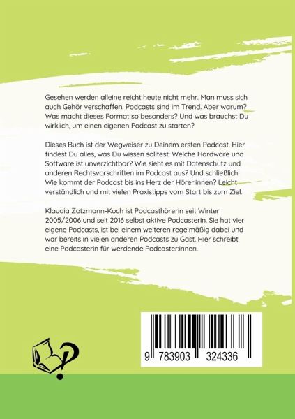 Gesehen werden alleine reicht heute nicht mehr. Man muss sich auch Gehör verschaffen. Podcasts sind im Trend. Aber warum? Was macht dieses Format so besonders? Und was brauchst Du wirklich, um einen eigenen Podcast zu starten?Dieses Buch ist der Wegweiser zu Deinem ersten Podcast. Hier findest Du alles, was Du wissen solltest: Welche Hardware und Software ist unverzichtbar? Wie sieht es mit Datenschutz und anderen Rechtsvorschriften im Podcast aus? Und schließlich: Wie kommt der Podcast bis ins Herz der Hörer:innen? Leicht verständlich und mit vielen Praxistipps vom Start bis zum Ziel.Klaudia Zotzmann-Koch ist Podcasthörerin seit Winter 2005/2006 und seit 2016 selbst aktive Podcasterin. Sie hat vier eigene Sendungen, ist bei einer weiteren regelmäßig dabei und war bereits in vielen anderen Podcasts zu Gast. Hier schreibt eine Podcasterin für werdende Podcaster:innen.