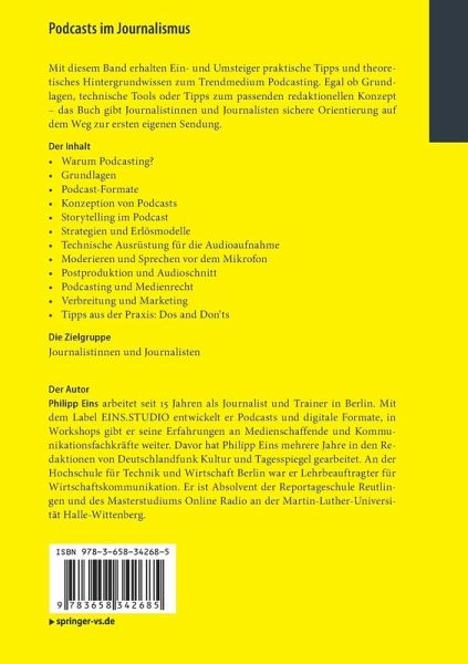 Einleitung. Warum Podcasting?.- Grundlagen.- Podcast-Formate.- Storytelling im Podcast.- Konzeption von Podcasts.- Storytelling im Podcast.- Strategien und Erlösmodelle.- Technische Ausrüstung für die Audioaufnahme.- Moderieren und Sprechen vor dem Mikrofon.- Postproduktion und Audioschnitt.- Podcasting und Medienrecht.- Verbreitung und Marketing.- Tipps aus der Praxis: Do´s and Dont´s.- Literaturangaben.