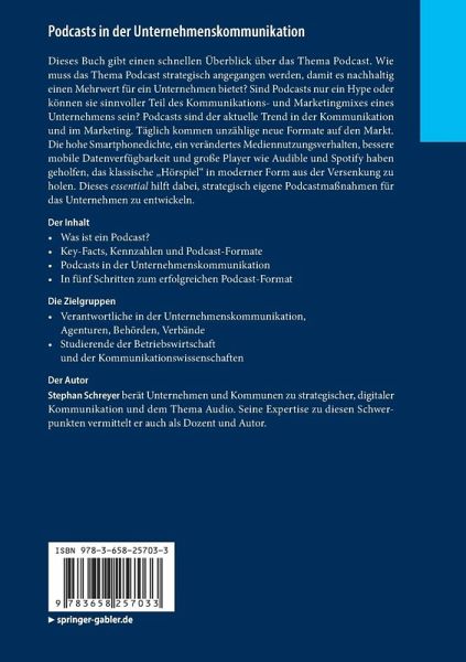 Dieses Buch gibt einen schnellen Überblick über das Thema Podcast. Wie muss das Thema Podcast strategisch angegangen werden, damit es nachhaltig einen Mehrwert für ein Unternehmen bietet? Sind Podcasts nur ein Hype oder können sie sinnvoller Teil des Kommunikations- und Marketingmixes eines Unternehmens sein? Podcasts sind der aktuelle Trend in der Kommunikation und im Marketing. Täglich kommen unzählige neue Formate auf den Markt. Die hohe Smartphonedichte, ein verändertes Mediennutzungsverhalten, bessere mobile Datenverfügbarkeit und große Player wie Audible und Spotify haben geholfen, das klassische "Hörspiel" in moderner Form aus der Versenkung zu holen. Dieses essential hilft dabei, strategisch eigene Podcastmaßnahmen für das Unternehmen zu entwickeln.