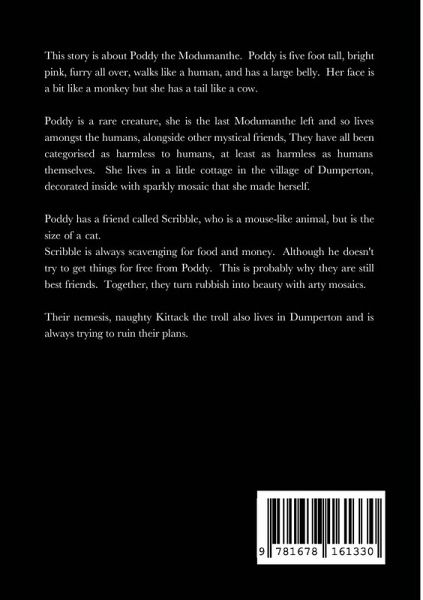 This story is about Poddy and her friend Scribble. She is the last Modumanthe left and so lives in the village of Dumperton, amongst the humans, alongside other mystical friends. They share the village with their nemesis, Kittack the troll, who always tries to spoil their plans.