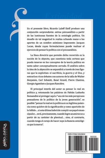 En el presente libro, Ricardo Laleff Ilieff produce una conjunción sorprendente: extrae psicoanálisis a partir de las luminosas fuentes de la ontología política. Un desafío de tal magnitud lo realiza echando mano a los aportes de un nombre asimismo imponente: Jacques Lacan, desde cuyas formulaciones puede realizar el ejercicio de pensar lo político con el psicoanálisis. La línea directriz que permite el recorrido propuesto por el autor es la noción de lo abyecto, que cuestiona toda certeza que pueda tenerse en los conceptos de la teoría política en tanto saber conceptualmente cerrado. El análisis sobre la idea de la abyección se expandirá a través de tres figuras que la explicitan: el sacrificio, la guerra y el Uno, y entrará en ricos debates con autores de la talla de Walter Benjamin, Carl Schmitt, René Girard, Pierre Clastres, Giorgio Agamben o Jacques Rancière. El principal interés del autor es pensar lo real en política y, retomando las palabras de Fabián Ludueña Romandini al prologar aquí a "uno de los más perspicuos pensadores de lo político de la joven generación", es posible "pensar lo real en la política en su legítima potencia como quiebre de la significación y como aparición de lo fallido... si esta última habrá de cumplir un papel emancipador... será, precisamente, cuando logre asumirse no a partir de su carácter de plenitud... sino, al contrario, cuando tenga el coraje de hacer suya la hiancia ontológica que la marca".