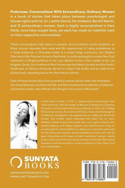 Dr. Lisette Garcia is an experimental psychologist, human rights activist, Buddhist scholar, and Latina percussionist. Her first book, "Poderosas: Conversations with Extraordinary Women," is a series of stories that take place between Dr. Garcia, her husband Barrett Martin, and 12 extraordinary women. Each woman is highly accomplished in her field, none have sought fame, yet all have made an indelible mark on their respective communities. These conversations take place in unusual and sometimes exotic locations, as these women describe their work and life experiences: A Latina pediatrician at a Texas barbeque, a Cherokee healer during a sweat lodge ceremony, two Shipibo shamans in the Peruvian Amazon Rainforest, an anthropologist in a noisy New York restaurant, a Tlingit professor in her cozy Alaskan home, a Zen master in her Los Angeles Zendo, two mothers in their homes near the Mexico border and the Pacific Northwest, an African American dancer in a New York studio, and an artist in her pick up truck, speeding across the New Mexico desert. Each of these stories show how powerful a woman can when she embraces her circumstances, envisions her life, and then transforms herself into a "Poderosa" - a powerful woman, who affects real change in her corner of the world.
