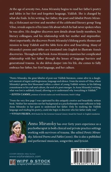 At the age of seventy-two, Anna Miransky begins to read her father's poetry and fables in her first and forgotten language, Yiddish. She is changed by what she finds. In his writing, her father, the poet and fabulist Peretz Miransky, a Holocaust survivor and member of the celebrated literary group Yung Vilne, reveals aspects of his inner life about which he had never spoken when he was alive. His daughter discovers new details about family members, his literary colleagues, and his relationship with her mother and stepmother. Most importantly, she discovers Peretz Miransky's lifelong poetic themes and mission to keep Yiddish and the fable form alive and flourishing. Many of Miransky's poems and fables are translated into English to illustrate Anna's discoveries. Throughout the book Anna Miransky examines her complicated relationship with her father through the lenses of language barriers and generational trauma. As she delves deeper into his life, she comes to fully embrace her father, her first language, and her culture.