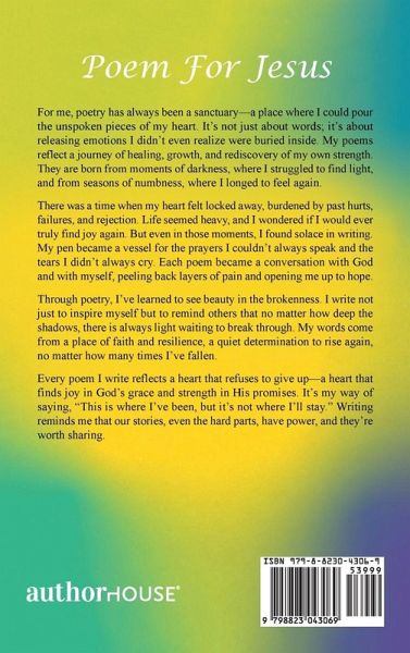 For me, poetry has always been a sanctuary-a place where I could pour the unspoken pieces of my heart. It's not just about words; it's about releasing emotions I didn't even realize were buried inside. My poems reflect a journey of healing, growth, and rediscovery of my own strength. They are born from moments of darkness, where I struggled to find light, and from seasons of numbness, where I longed to feel again. There was a time when my heart felt locked away, burdened by past hurts, failures, and rejection. Life seemed heavy, and I wondered if I would ever truly find joy again. But even in those moments, I found solace in writing. My pen became a vessel for the prayers I couldn't always speak and the tears I didn't always cry. Each poem became a conversation with God and with myself, peeling back layers of pain and opening me up to hope. Through poetry, I've learned to see beauty in the brokenness. I write not just to inspire myself but to remind others that no matter how deep the shadows, there is always light waiting to break through. My words come from a place of faith and resilience, a quiet determination to rise again, no matter how many times I've fallen. Every poem I write reflects a heart that refuses to give up-a heart that finds joy in God's grace and strength in His promises. It's my way of saying, "This is where I've been, but it's not where I'll stay." Writing reminds me that our stories, even the hard parts, have power, and they're worth sharing.