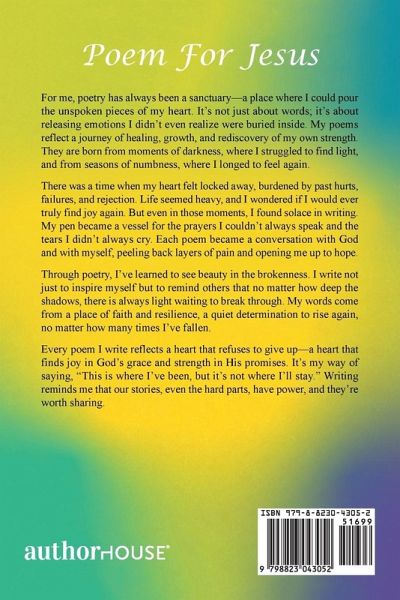 For me, poetry has always been a sanctuary-a place where I could pour the unspoken pieces of my heart. It's not just about words; it's about releasing emotions I didn't even realize were buried inside. My poems reflect a journey of healing, growth, and rediscovery of my own strength. They are born from moments of darkness, where I struggled to find light, and from seasons of numbness, where I longed to feel again. There was a time when my heart felt locked away, burdened by past hurts, failures, and rejection. Life seemed heavy, and I wondered if I would ever truly find joy again. But even in those moments, I found solace in writing. My pen became a vessel for the prayers I couldn't always speak and the tears I didn't always cry. Each poem became a conversation with God and with myself, peeling back layers of pain and opening me up to hope. Through poetry, I've learned to see beauty in the brokenness. I write not just to inspire myself but to remind others that no matter how deep the shadows, there is always light waiting to break through. My words come from a place of faith and resilience, a quiet determination to rise again, no matter how many times I've fallen. Every poem I write reflects a heart that refuses to give up-a heart that finds joy in God's grace and strength in His promises. It's my way of saying, "This is where I've been, but it's not where I'll stay." Writing reminds me that our stories, even the hard parts, have power, and they're worth sharing.