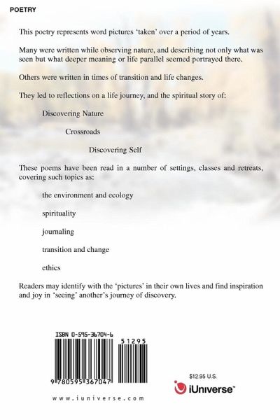 This poetry represents word pictures 'taken' over a period of years. Many were written while observing nature, and describing not only what was seen but what deeper meaning or life parallel seemed portrayed there. Others were written in times of transition and life changes. They led to reflections on a life journey, and the spiritual story of: Discovering Nature Crossroads Discovering Self These poems have been read in a number of settings, classes and retreats, covering such topics as: the environment and ecology spirituality journaling transition and change ethics Readers may identify with the 'pictures' in their own lives and find inspiration and joy in 'seeing' another's journey of discovery.