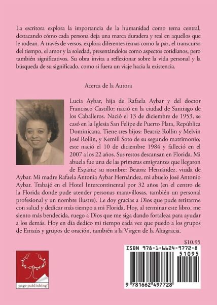 La escritora explora la importancia de la humanidad como tema central, destacando cómo cada persona deja una marca duradera y real en aquellos que le rodean. A través de versos, explora diferentes temas como la paz, el transcurso del tiempo, el amor y la soledad, presentándolos como aspectos cotidianos, pero también significativos. Su obra invita a reflexionar sobre la vida personal y la búsqueda de su significado, como si fuera un viaje hacia la existencia.