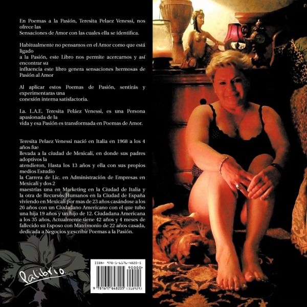 En Poemas a la Pasión, Teresita Pelaez Venessi, nos ofrece las Sensaciones de Amor con las cuales ella se identifica. Habitualmente no pensamos en el Amor como que está ligado a la Pasión, este Libro nos permite acercarnos y así encontrar su influencia este libro genera sensaciones hermosas de Pasión al Amor Al aplicar estos Poemas de Pasión, sentirás y experimentaras una conexión interna satisfactoria. La. L.A.E. Teresita Peláez Venessi, es una Persona apasionada de la vida y esa Pasión es transformada en Poemas de Amor.