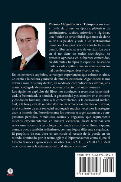 Poemas Ahogados en el Tiempo es un viaje a través de diferentes épocas, pletóricas de sentimientos, sueños, misterios y lágrimas, una fluidez de sensibilidad que trata de darle valor a la palabra y vida a los sentimientos humanos. Una provocación a los lectores; un desafío libertario al arte de escribir. La obra en si no tiene un orden cronológico, se presenta agrupada en diferentes contenidos, en diferentes tiempos y espacios, buscando darle a cada capítulo una secuencia emocional que desahogue ideas y contrastes. En los primeros capítulos, se recogen experiencias que enlutan el alma, un canto a la belleza y miseria de nuestra existencia. Algunos temas nos llevan a mirarnos muy dentro, en medio de contradicciones vividas, una manera obligada de reconocernos en cada circunstancia humana. Los siguientes capítulos del libro, nos conducen a reconocer la solidaridad, la fraternidad, la bondad, la generosidad y el asombro en el entorno y condición humana; otras a la contemplación, a la curiosidad intelectual, a la búsqueda de nuestro destino en otros pensamientos o historias, en el contexto de una sociedad subyugada muchas veces por la arrogancia y la imposición. Posteriormente los poemas recogen ausencias y compasiones perdidas, románticos sueños y angustias, que seguramente muchos experimentamos en nuestra existencia, hasta terminar con reflexiones sobre una tecnología que tiende a sustituir al Homo sapiens, aunque puede también redimirnos, con una lógica diferente y regulada. El propósito de esta obra es contribuir al rescate de la poesía en un mundo dominado por la tecnología y el hiperconsumo; como dijera el filósofo francés Lipovesky en su obra LA ERA DEL VACIO "El ideal ascético ya no es la referencia cultural sino el consumo".