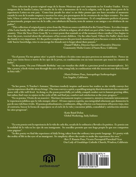 Era mi sueño escribir un librito de poesía bilingüe, con temas relacionados a situaciones de la vida diaria. Como me identifico con la cultura Latina, las situaciones se tratan de la familia, religión, educación y un poco de humor. Claro, no podían faltar temas de decepción amorosa. Los poemas fueron escritos originalmente en Español y luego traducidos a Inglés. Por favor recuerden que se traduce la idea en general. No traten de encontrar una traducción de palabra por palabra. Traducir es dificil en la escritura en general; en la poesía, el reto es aún más grande. Doy gracias primeramente a Dios por el regalo de trabajar con palabras. Después agradezco a mi familia por apoyarme en mis intereses. Luego, doy gracias a mis parientes, amigos y estudi- antes por el estímulo que siempre me ofrecen.