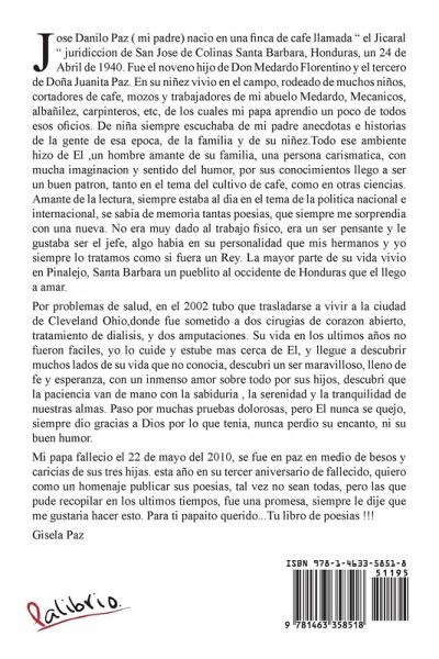 Jose Danilo Paz ( mi padre) nacio en una finca de cafe llamada " el Jicaral " juridiccion de San Jose de Colinas Santa Barbara, Honduras, un 24 de Abril de 1940. Fue el noveno hijo de Don Medardo Florentino y el tercero de Doña Juanita Paz. En su niñez vivio en el campo, rodeado de muchos niños, cortadores de cafe, mozos y trabajadores de mi abuelo Medardo, Mecanicos, albañilez, carpinteros, etc, de los cuales mi papa aprendio un poco de todos esos oficios. De niña siempre escuchaba de mi padre anecdotas e historias de la gente de esa epoca, de la familia y de su niñez.Todo ese ambiente hizo de El ,un hombre amante de su familia, una persona carismatica, con mucha imaginacion y sentido del humor, por sus conocimientos llego a ser un buen patron, tanto en el tema del cultivo de cafe, como en otras ciencias. Amante de la lectura, siempre estaba al dia en el tema de la politica nacional e internacional, se sabia de memoria tantas poesias, que siempre me sorprendia con una nueva. No era muy dado al trabajo fisico, era un ser pensante y le gustaba ser el jefe, algo habia en su personalidad que mis hermanos y yo siempre lo tratamos como si fuera un Rey. La mayor parte de su vida vivio en Pinalejo, Santa Barbara un pueblito al occidente de Honduras que el llego a amar. Por problemas de salud, en el 2002 tubo que trasladarse a vivir a la ciudad de Cleveland Ohio,donde fue sometido a dos cirugias de corazon abierto, tratamiento de dialisis, y dos amputaciones. Su vida en los ultimos años no fueron faciles, yo lo cuide y estube mas cerca de El, y llegue adescubrir muchos lados de su vida que no conocia, descubri un ser maravilloso, lleno de fe y esperanza, con un inmenso amor sobre todo por sus hijos, descubri que la paciencia van de mano con la sabiduria , la serenidad y la tranquilidad de nuestras almas. Paso por muchas pruebas dolorosas, pero El nunca se quejo, siempre dio gracias a Dios por lo que tenia, nunca perdio su encanto, ni su buen humor. Mi papa fallecio el 22 de mayo del 2010, se fue en paz en medio de besos y caricias de sus tres hijas. esta año en su tercer aniversario de fallecido, quiero como un homenaje publicar sus poesias, tal vez no sean todas, pero las que pude recopilar en los ultimos tiempos, fue una promesa, siempre le dije que me gustaria hacer esto. Para ti papaito querido...Tu libro de poesias !!! Gisela Paz