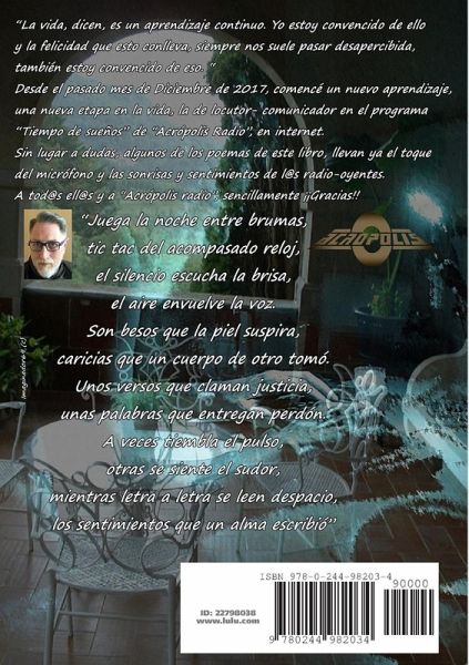 "La vida, dicen, es un aprendizaje continuo. Yo estoy convencido de ello y la felicidad que esto conlleva, siempre nos suele pasar desapercibida, también estoy convencido de eso. " Desde el pasado mes de Diciembre de 2017, comencé un nuevo aprendizaje, una nueva etapa en la vida, la de locutor- comunicador en el programa "Tiempo de sueños" de "Acrópolis Radio", en internet. Sin lugar a dudas, algunos de los poemas de este libro, llevan ya el toque del micrófono y las sonrisas y sentimientos de l@s radio-oyentes.