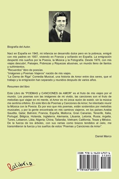 Este Libro de ?POEMAS y CANCIONES de AMOR? es el fruto de mis viajes por el mundo. Los Poemas son las Imágenes de mi vivido, las Canciones son el fruto de melodías que viajan en mi mente, el Amor es mi única razón de existir, sin la música me sentiría orfelino . En este libro de Poemas y Canciones de Amor, he intentado reunir la Música con la Poesía. Es por eso que mis poemas, están sostenidos por melodías musicales, y por la gente encontrada en mis caminos viajeros, en los países de Arabia Saudita, Qatar, Bahrein; Francia, España, Mallorca, Gran Canarias, Tenerife, Italia, Portugal, Bélgica, Holanda, Inglaterra, Alemania, Lituania, Letonia, Rusia; Argelia, Tunes, Lebanon, Libia, Nigeria; China, Tailandia, Vietnam; California, Texas y México. De la fuerza de los árboles, con sus ramas como brazos tendidos al cielo, me transmitieron la fuerza y los sueños de estos ?Poemas y Canciones de Amor?.