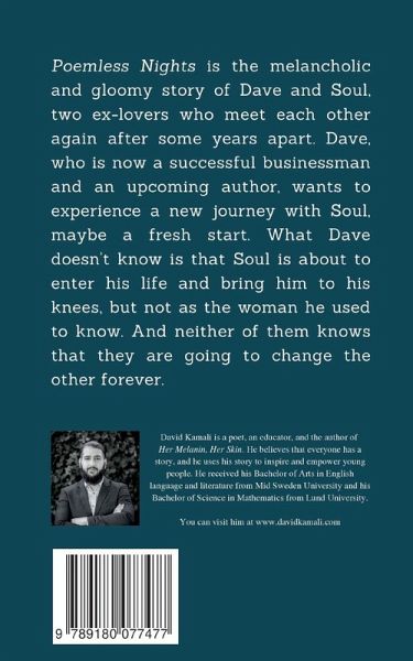 Poemless Nights is the melancholic and gloomy story of Dave and Soul, two ex-lovers who meet each other again after some years apart. Dave, who is now a successful businessman and an upcoming author, wants to experience a new journey with Soul, maybe a fresh start. What Dave doesn't know is that Soul is about to enter his life and bring him to his knees, but not as the woman he used to know. And neither of them knows that they are going to change the other forever.