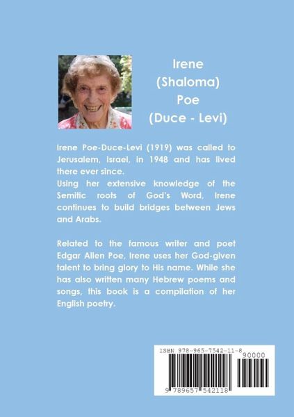 Irene Poe-Duce-Levi (1919) was called to Jerusalem, Israel, in 1948 and has lived there ever since. By using her extensive knowledge of the Semitic roots of God's Word, Irene continues to build bridges between Jews and Arabs. Related to the famous Edgar Allen Poe, Irene uses her God-given talent to bring glory to His name. While Irene has also written many Hebrew poems and songs, this book is a compilation of her English versions.