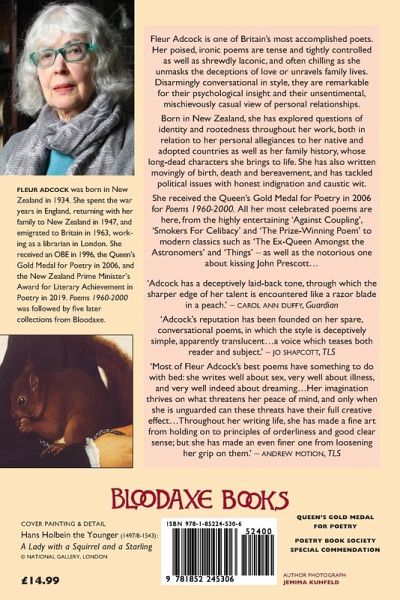 Fleur Adcock (1934-2024) was born in New Zealand in 1934. She spent the war years in England, returning with her family to New Zealand in 1947. She emigrated to Britain in 1963, working as a librarian in London until 1979. In 1977-78 she was writer-in-residence at Charlotte Mason College of Education, Ambleside. She was Northern Arts Literary Fellow in 1979-81, living in Newcastle, becoming a freelance writer after her return to London. She received an OBE in 1996, and The Queen's Gold Medal for Poetry in 2006 for Poems 1960-2000 (Bloodaxe Books, 2000). In October 2019 Fleur Adcock was presented with the New Zealand Prime Minister's Award for Literary Achievement in Poetry 2019 by the Rt Hon (now Dame) Jacinda Ardern. Fleur Adcock published three pamphlets with Bloodaxe: Below Loughrigg (1979), Hotspur (1986) and Meeting the Comet (1988), as well as her translations of medieval Latin lyrics, The Virgin & the Nightingale (1983). She also published two translations of Romanian poets with Oxford University Press, Orient Express by Grete Tartler (1989) and Letters from Darkness by Daniela Crasnaru (1994). All her other collections were published by Oxford University Press until they shut down their poetry list in 1999, after which Bloodaxe published her Poems 1960-2000 (2000), followed by Dragon Talk (2010), Glass Wings (2013), The Land Ballot (2015), Hoard (2017) and The Mermaid's Purse (2021). Poems 1960-2000 and Hoard were Poetry Book Society Special Commendations while Glass Wings was a Poetry Book Society Recommendation. Fleur Adcock's Collected Poems was published by Bloodaxe Books in hardback and paperback on her 90th birthday, 10 February 2024. This is an expanded edition of the Collected Poems published in New Zealand in hardback only by Victoria University Press in 2019. The expanded edition was published simultaneously in New Zealand in paperback only by the same publisher, now known as Te Herenga Waka University Press.