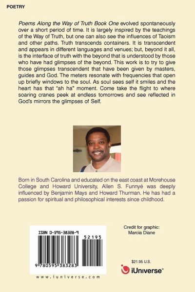Poems Along the Way of Truth Book One evolved spontaneously over over a short period of time. It is largely inspired by the teachings of the Way of Truth, but one can also see the influences of Taoism and other paths. Truth transcends containers. It is transcendent and appears in different languages and venues; but, beyond it all, is the interface of truth with the beyond that is understood by those who have had glimpses of the beyond. This work is to try to give those glimpses transcendent that have been given by masters, guides and God. The meters resonate with frequencies that open up briefly windows to the soul. As soul sees self it smiles and the heart has that 'ah ha" moment. Come take the flight to where soaring cranes peek at endless tomorrows and see reflected in God's mirrors the glimpses of Self.